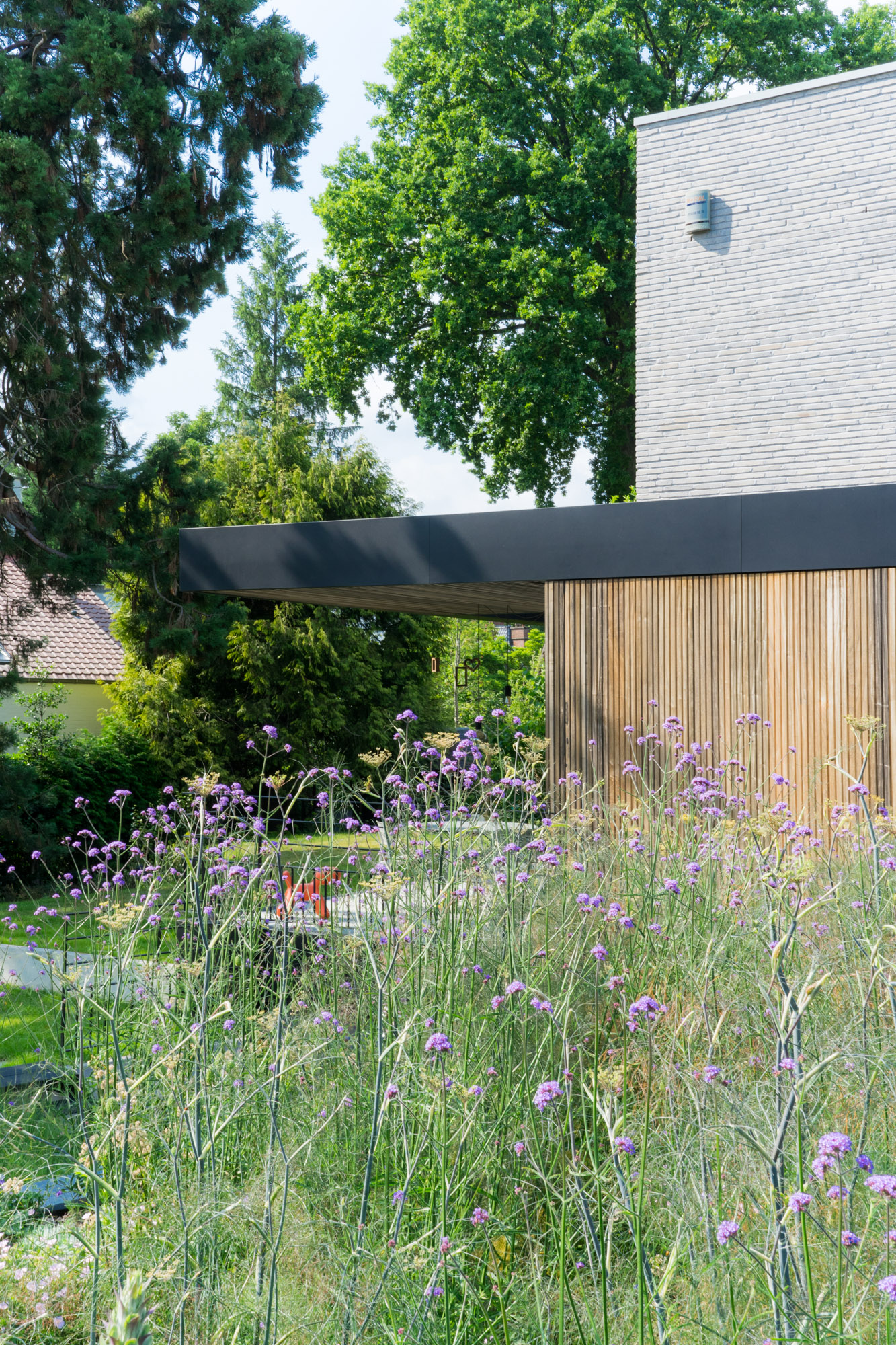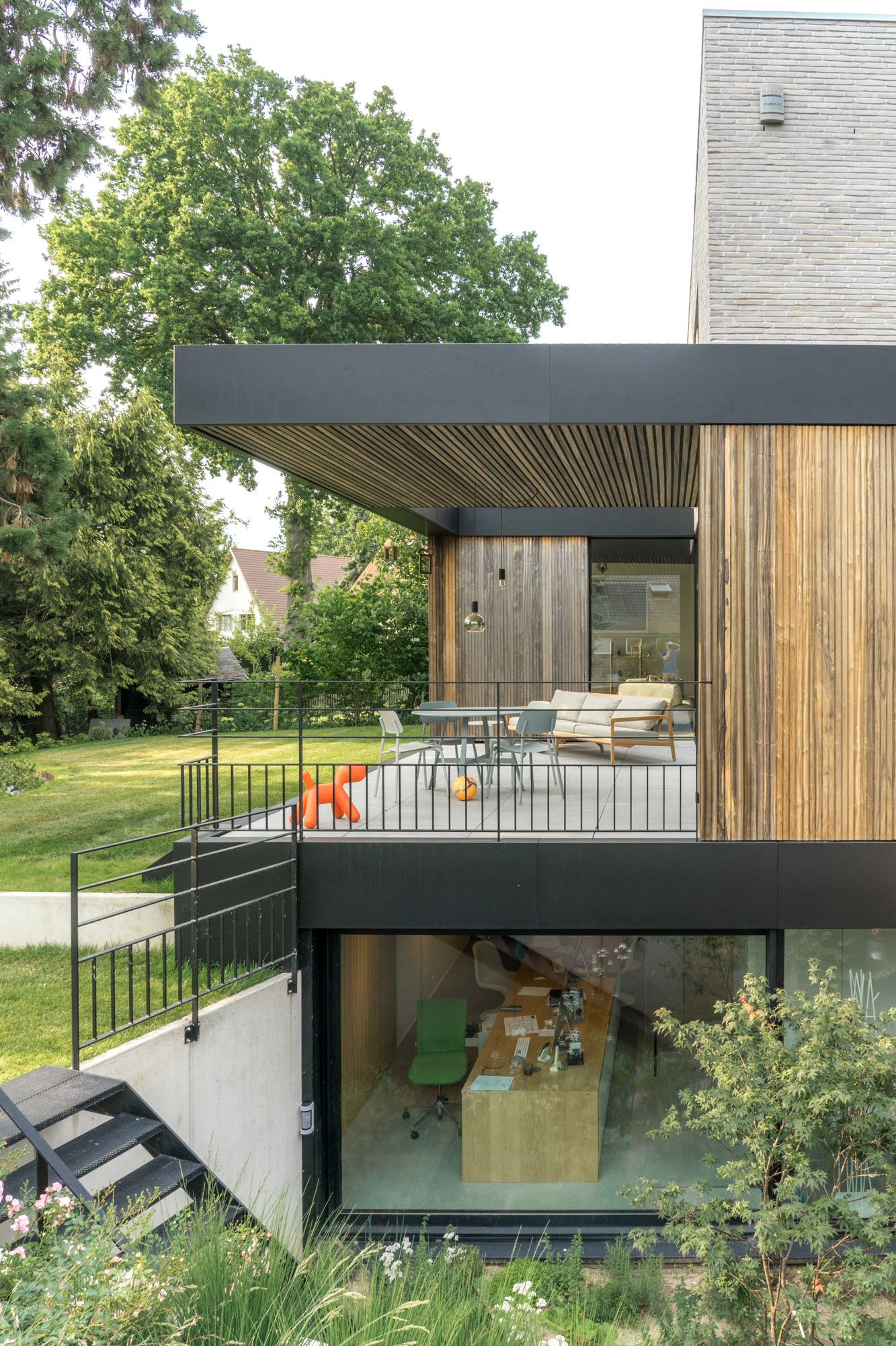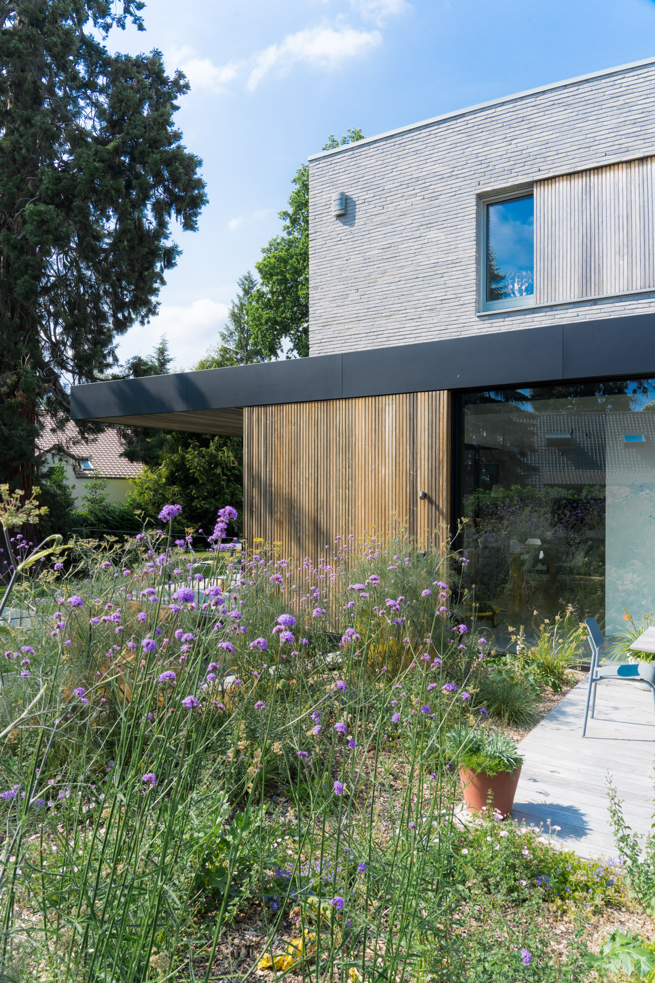 Une terrasse couverte prolonge naturellement les espaces intérieurs : elle permet de profiter pleinement du jardin tout en restant protégée lors des journées fortement ensoleillées.