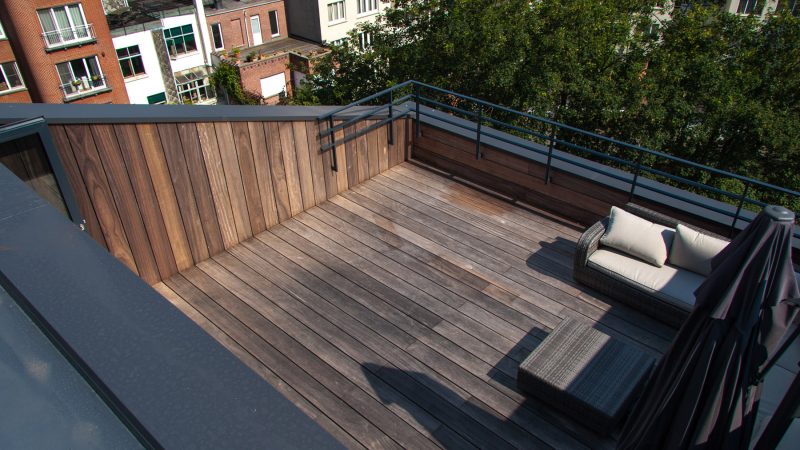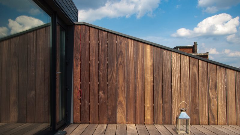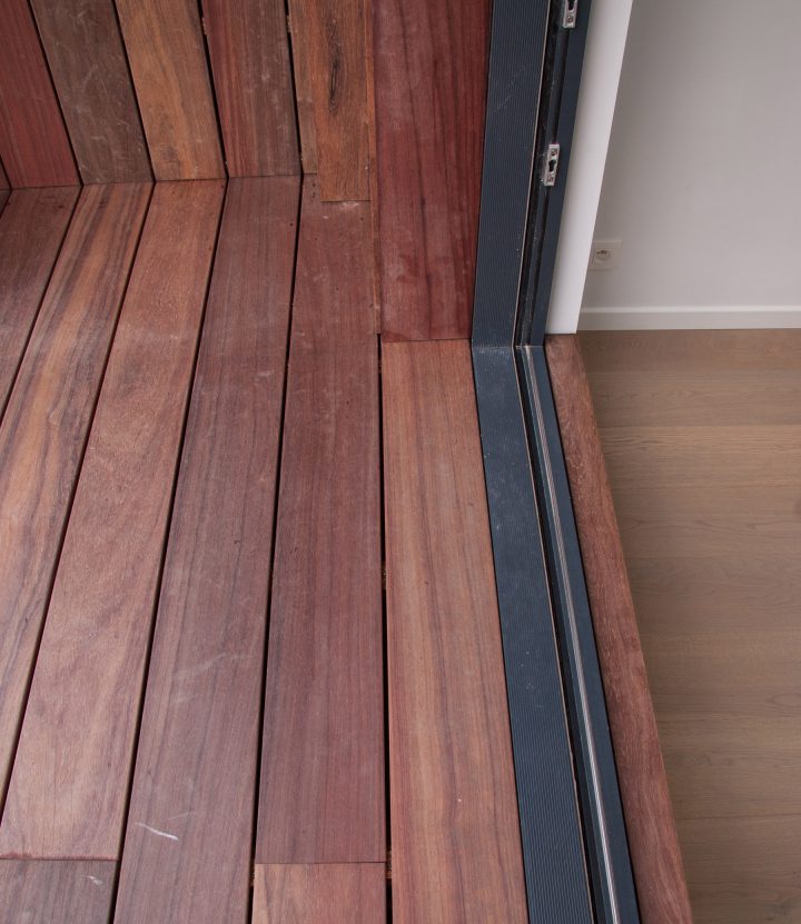 Afin de créer une continuité infinie entre les espaces et les surfaces, chaque détail compte : le bardage en Padouk des terrasses extérieures ne fait qu’un entre le sol et le mur, les châssis des fenêtres sont dans la continuité du sol et enfin la structure de l’escalier, très légère, offre transparence à la lumière.