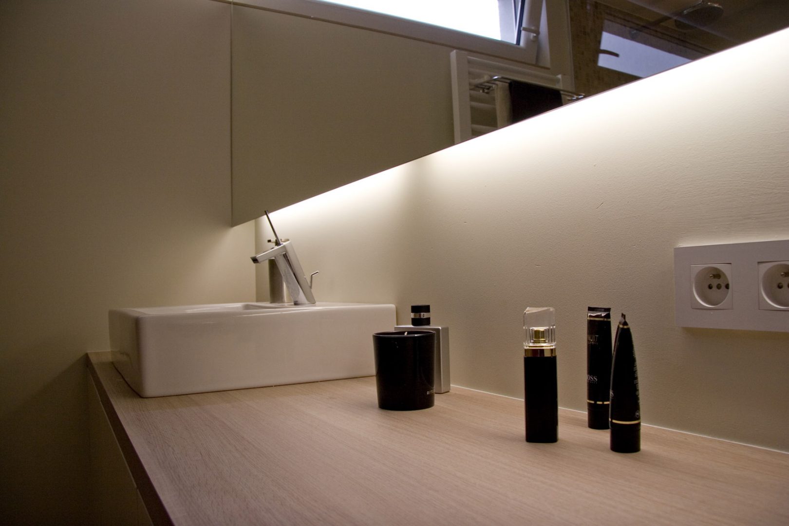 L’intervention s’est focalisée sur une petite extension de salle bain. De taille restreinte, l’espace a été maximisé afin de le rendre au mieux fonctionnel. Jouant la carte du fait sur mesure, cette salle de bain accueille une douche vénitienne et un mobilier personnalisé.